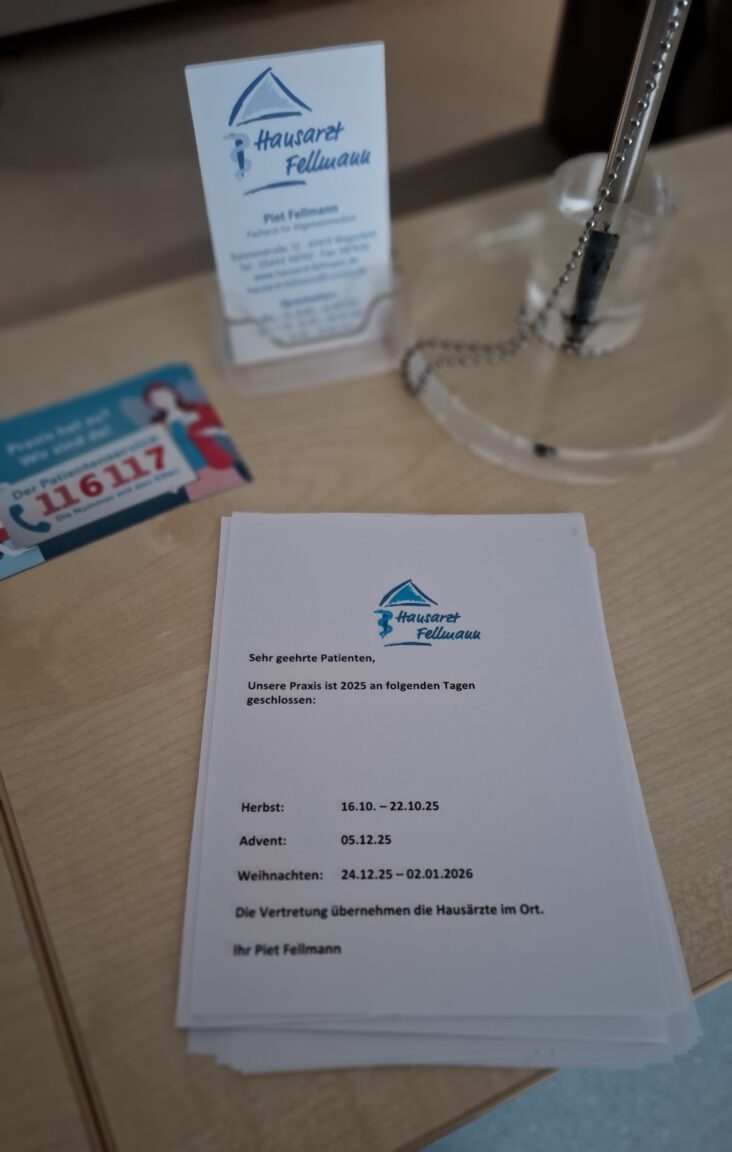 Außerhalb der üblichen Praxiszeiten, am Wochenende/Feiertagen ist der Notdienst unter 116117 zu erreichen.